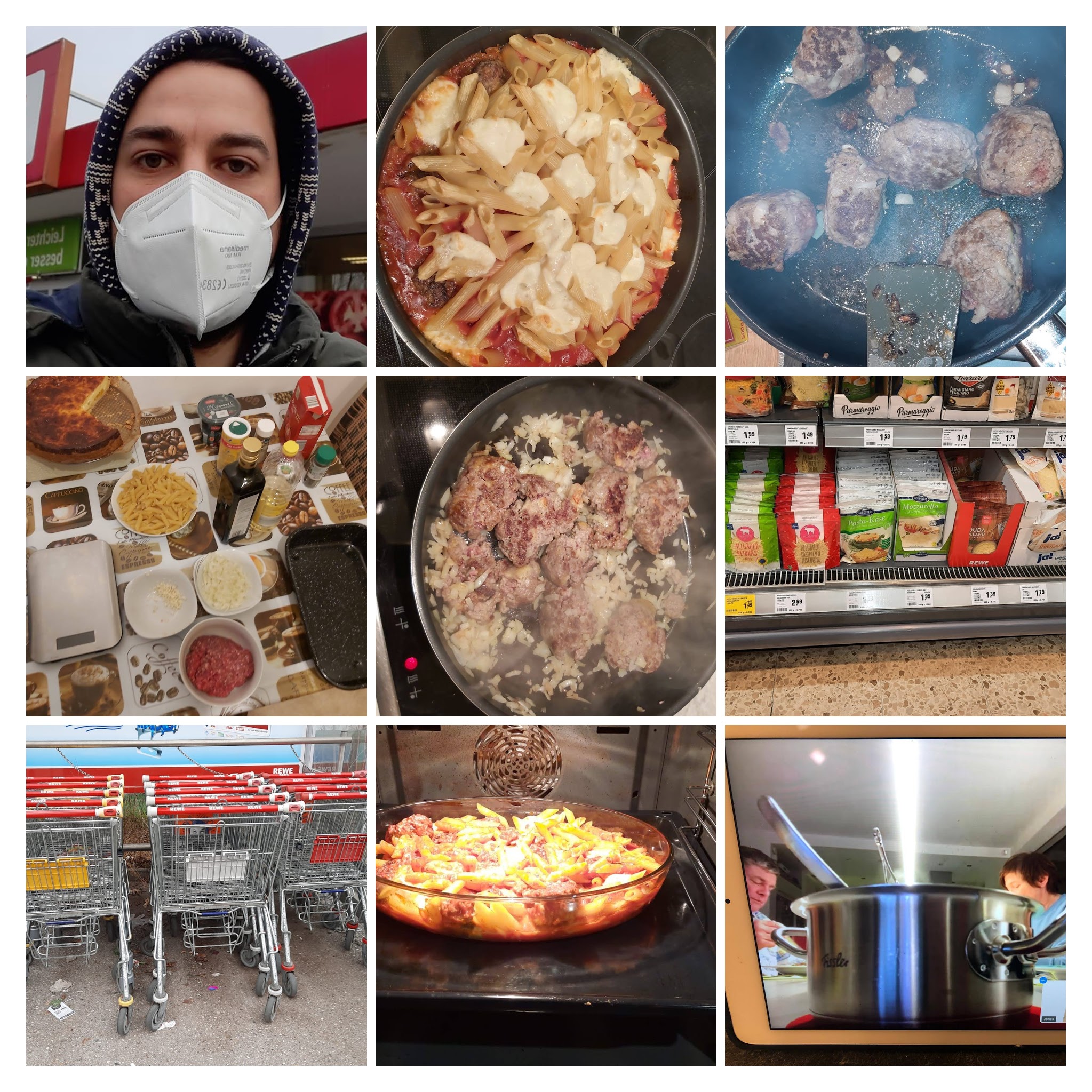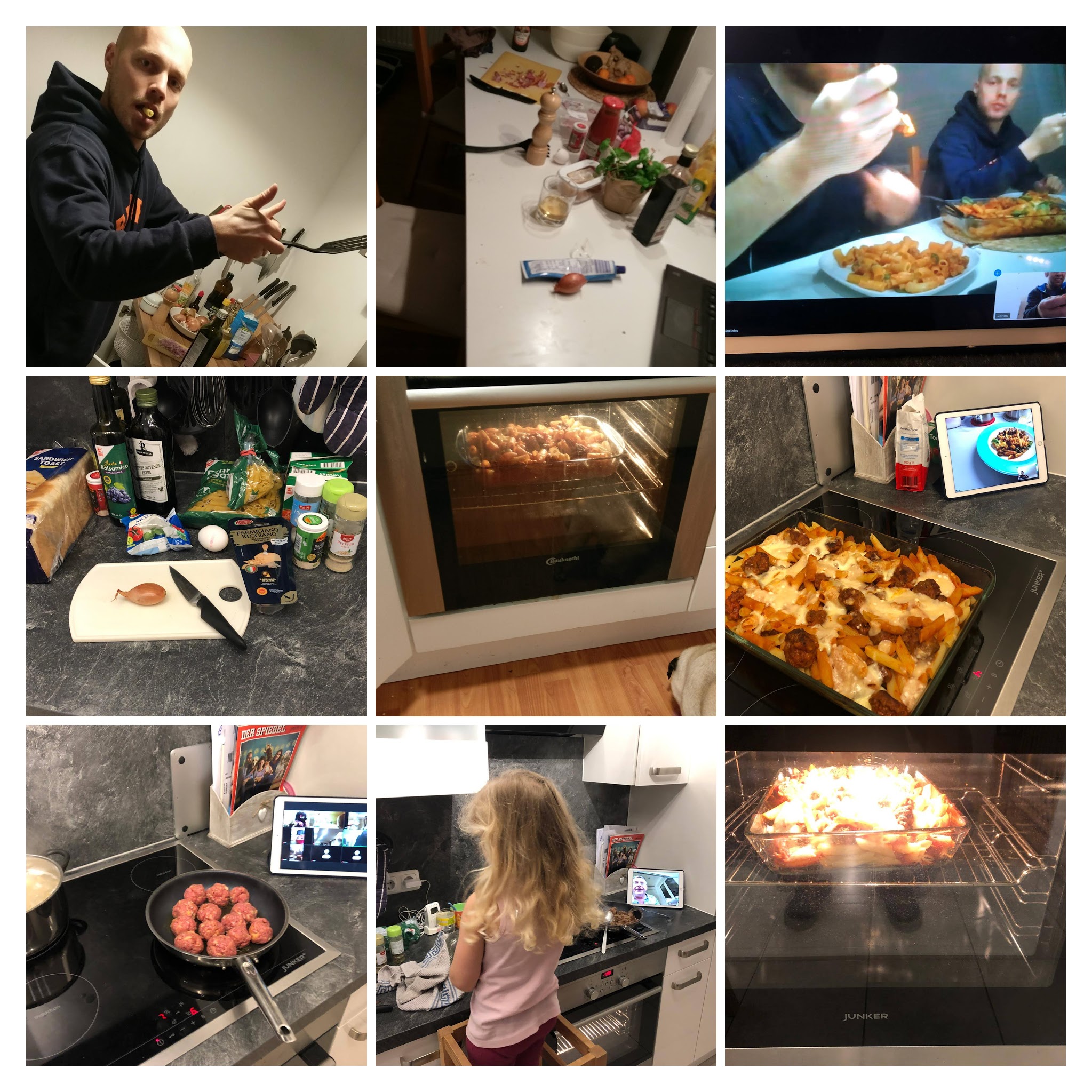 Sie sehen gut aus, sie sind sehr musikalisch, jetzt können sie auch noch kochen. „Pasta à la Gabi“ gab es am Sonntag bei den Helden der Herren-1, die von Chefkoch Ralph pünktlich um 17:30 Uhr in die Homeküche gerufen wurden. Doch ein entspannter Abend sollte es nicht werden: Mit hoher Linienhärte marschierte Ralph voran, forderte das zügige Würfeln der Zwiebeln (die auf der Einkaufsliste Schalotten waren) und überraschte das Team damit, dass auf einmal Senf mit rein sollte (was gar nicht auf der Liste stand). Ein Sprint zum Kühlschrank und wieder zurück zur Kamera, wo die nächsten Anweisungen folgten. Backofen vorheizen, Hackbällchen formen, Basilikum abpflücken und das bei so unbekannten Begriffen wie Passierte Tomaten, Paprika edelsüß oder Balsamico Aceto.