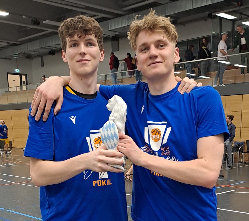 (Von der H2 in die ProB: Sadi und Luis nach dem Gewinn des Bezirkspokals 2023 mit der H2, spielten in der abgelaufenen Saison in Jahns Herren-1 und bei Kooperationspartner Oberhaching. Beim Top4 halfen sie im Orga-Team).