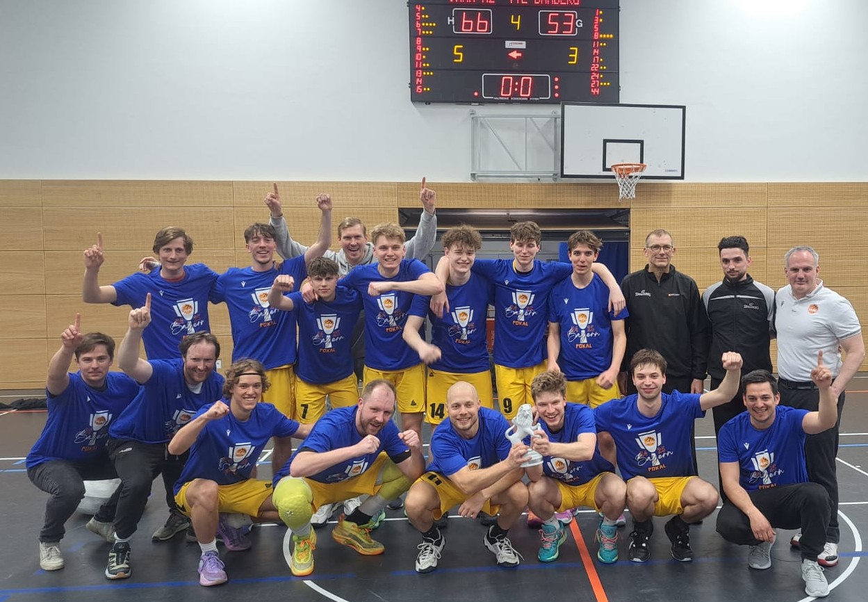 Großer Jubel in der Jahnhalle: Mit 66:53 gewinnt unsere H2 gegen TTL Bamberg das Finale im Bayernpokal und reißt kurze Zeit später den Bayerischen Löwen in die Höhe. Der Coup ist gelungen: Erstmals überhaupt gewinnt eine Mannschaft aus der Bezirksoberliga den begehrten Bayerischen Titel und überrumpelt das Teilnehmerfeld aus diversen Regionalligisten. Doch der Reihe nach…(Die Pokalhelden stellen sich mit ihren Siegershirts zum offiziellen Foto auf.)
