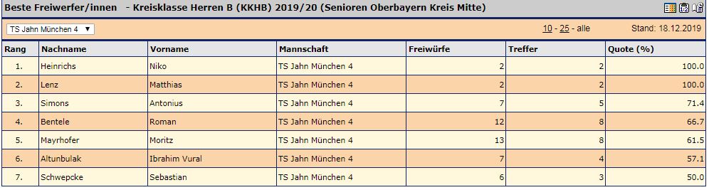 Sportlich läuft es bislang hervorragend für unsere tapferen Coaches: Angeführt von Midrange-Legende Dr. Matthias Lenz (4.7 Punkte pro Spiel) steht das Team derzeit mit fünf Siegen aus fünf Spielen auf dem ersten Tabellenplatz der Kreisklasse B und nimmt klaren Kurs auf die Kreisklasse A. Noch wichtiger ist den Herren jedoch die Freiwurfquote von 65,3 %, die nicht nur Ligaspitze ist, sondern zugleich besser als die aller anderen Jahn-Herrenteams. Und wenn der Schwepcke mal mit Brett werfen würde, wäre sie noch höher.