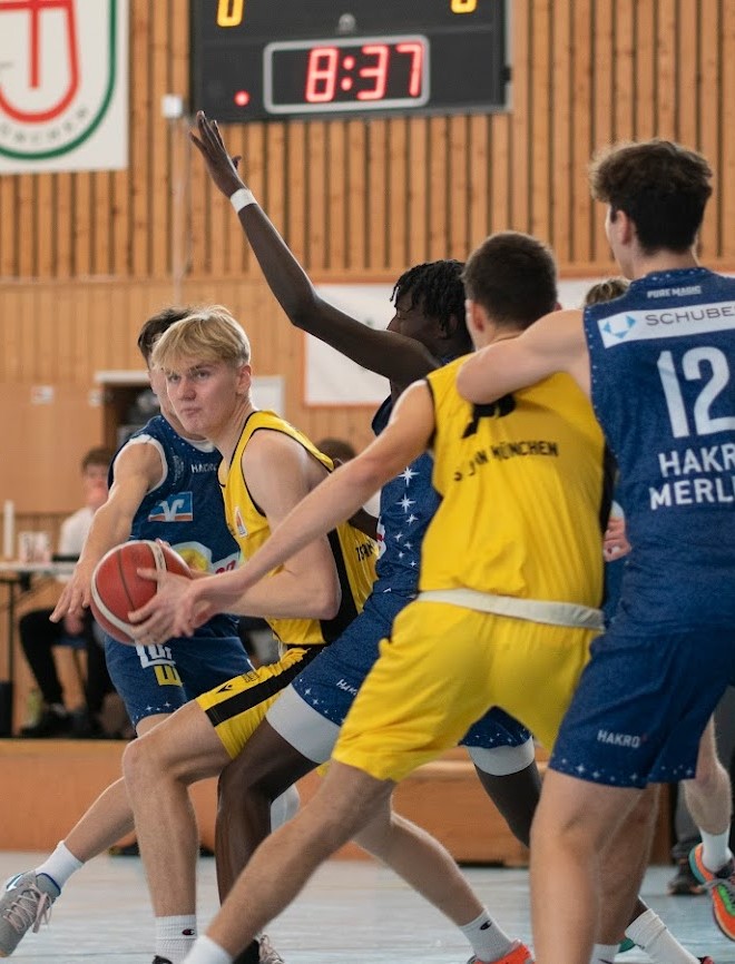 So ganz einfach ging es aber doch nicht von der Hand, Jahn nahm sich eine weitere Krise und lag nach dem dritten Viertel doch wieder empfindlich hinten (41:50), ehe Alan „I-refuse-to-lose“ de Vries im Schlussdurchgang fünf seiner sieben (!) Dreier ins Ziel steuerte – die allermeisten auf Zuspiel von Nico Hirtl (daher zehn Assists, fünf Steals, sieben Punkte). So konnte das hitzige und nervige Match doch noch mit 64:58 für München ausgehen.