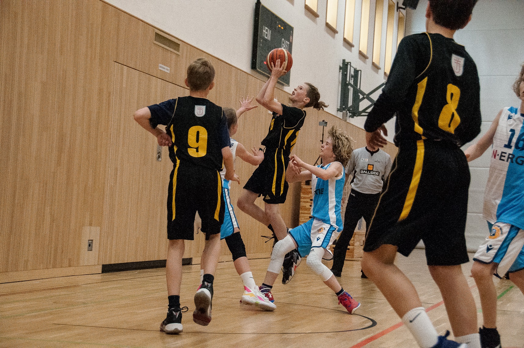Für die darauffolgende Bayerische Meisterschaft gab es dann einen perfiden Plan, als Spielstätte wurde die Turnhalle der Ruth-Drexel-Schule gewählt. Vordergründig, weil sich nur dort die Körbe auf die geforderte U12 Höhe absenken lassen, die eigentliche Taktik dahinter war aber eine ganz andere. Der Gegner sollte vorab schon durch eine absolute Parkplatzverknappung zermürbt werden und schon leicht genervt in der Halle ankommen. Das klappte hervorragend, nur wurden als Kollateralschaden auch die Schiedsrichter in Mitleidenschaft gezogen, was sie aber netterweise nicht übelnahmen, sondern eher als Ansporn, richtig gut zu pfeifen, danke dafür.