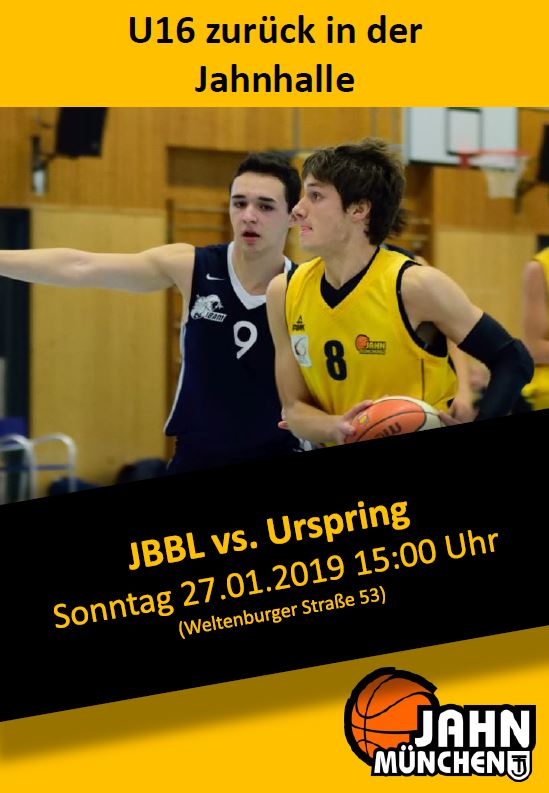 Nach vier Auswärtsspielen in Folge empfangen unsere U16-Bundesliga-Jungs am Sonntag (27.01.) Urspring zum Heimauftakt 2019. Das Spiel findet um 15:00 in der Jahnhalle statt. Wir freuen uns auf eure Unterstützung und versprechen, dass wir uns anstrengen.