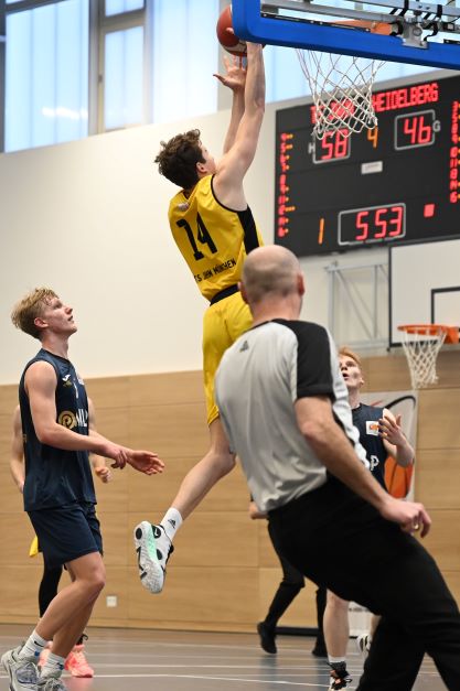 Glück gehabt! Weil Heidelberg auf der A8 in einen Stau geraten war und zudem auf zwei der gefährlichsten Akteure – die Brüder Rothmann - verzichten musste, dauerte es mehr als ein Viertel, ehe die Gäste ihre Anfangsschwäche (25:12) überwinden konnten. Ihr einminütiger 7:0-Lauf unmittelbar vor der Pause verkürzte von einer 20-Punkte-Führung Jahns auf 37:24 und setzte sichtlich Kräfte frei.