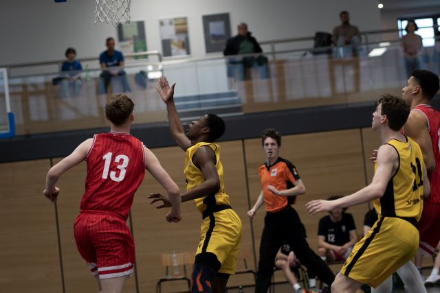 Wer gedacht hatte, dass es die Gäste aus Würzburg nach dem Herren-Regionalliga-Finalknüller am Abend zuvor (700 Zuschauer, Sieg gegen Veitshöchheim) ruhig angehen würden beim letztlich bedeutungslosen Match der NBBL-Abstiegsrunde (Würzburg sicher Erster, Jahn sicher im Mittelfeld) – der sah sich getäuscht und ein munteres Spielchen mit phasenweise erstaunlichen Wurfquoten aus allen Lagen.