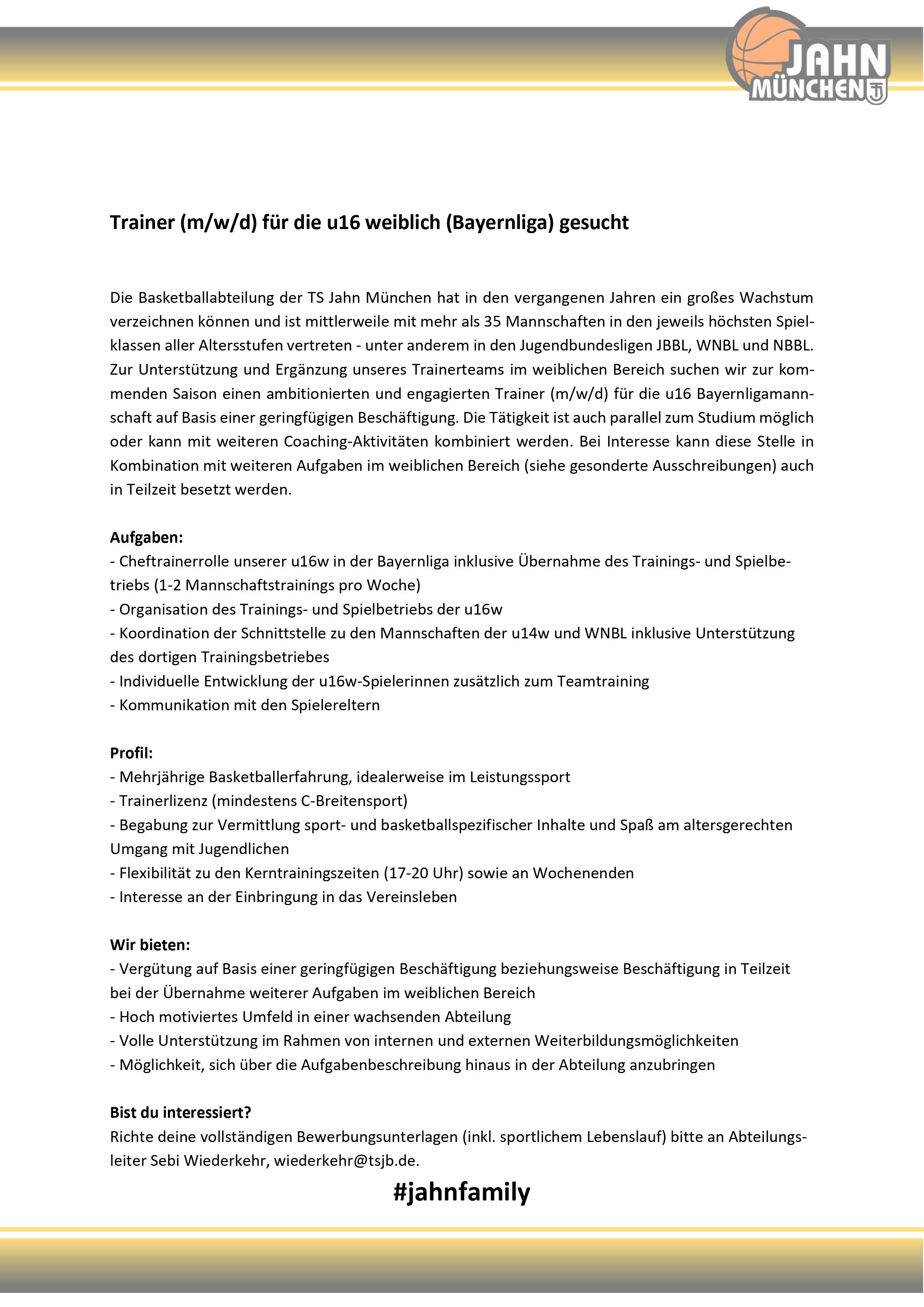 Die Turnerschaft Jahn München sucht für die kommende Saison Unterstützung für das Trainerteam im Jugendbereich. Bieten können wir uns sowohl eine Beschäftigung in Vollzeit (40h), als auch eine geringfügigen Beschäftigung im weiblichen Bereich zum nächstmöglichen Zeitpunkt. Interessenten für die folgenden Stellen können sich gerne bei Abteilungsleiter Sebi Wiederkehr unter wiederkehr@tsjb.de melden: