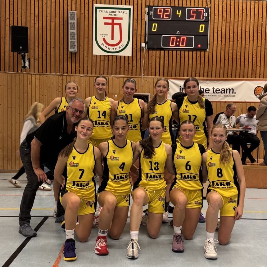 Sonntagnachmittag 15h im Jahn, das klingt schon eher nach dem Geschmack der jungen Athletinnen, zumal in Anschluss daran die JBBL ihr ewiges Lokalderby gegen den Nachwuchs des örtlichen Euroleague-Vereins absolvierte (Spoiler: und Jahn schließlich sehr deutlich gewann!). Landshut gilt als eines der stärkeren Teams in der U18w-BOL, Konzentration war also angesagt im Lager der Gastgeberinnen! Nach einem Viertel voll lascher Defense und nonchalanten Umgangs mit Korbleger-Chancen (21:20) fanden die Jahn-Mädels doch noch in ihren Spielrhythmus, erhöhten über 49:34 (Halbzeit) und 70:46 (nach 30 Minuten) auf 92:57. Valentina Otterbein und Fanny Kirchhoff (je 17) waren die emsigsten Werferinnen, Eva Wimmer (13) und Kapitänin Alicia Neumann (10) folgten ihnen. Acht Dreier und 10/16 Freiwürfen lesen sich gut in den Stats, alle zehn Mädels hatten etwa gleich viel Minutenanteile: das war eine sehr gute Übung für die kommenden Aufgaben!